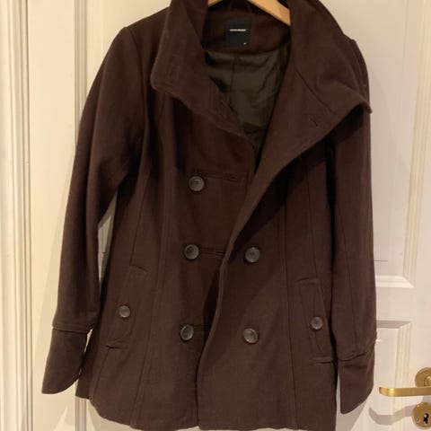 Vero Moda kåpe for dame i størrelse M. Kåpen er svart og laget i ullmateriale. Modellen har belte i livet, glidelås- og knappelukking foran samt lommer i sidene.