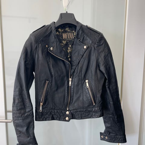 mbyM skinnjakke, dame størrelse S. Den har flere glidelåslommer, glidelåsdetaljer nederst på ermene og asymmetrisk glidelås foran. Nesten ikke brukt.