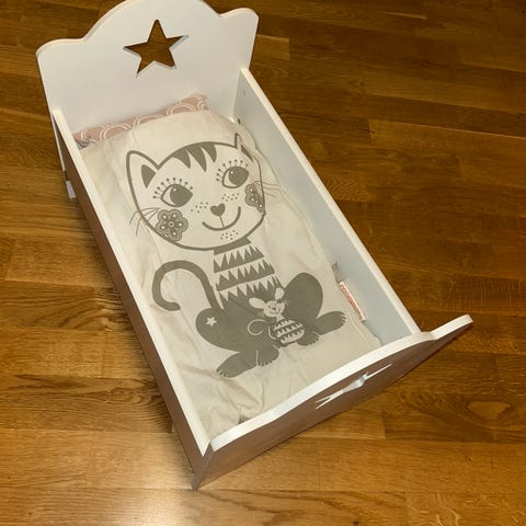 Noen bruksmerker på senga. Hakk og riper i maling.