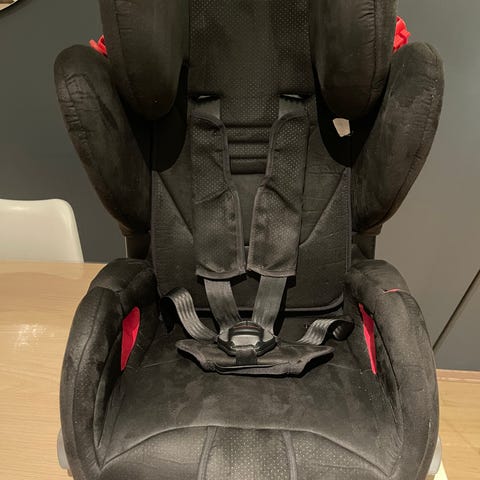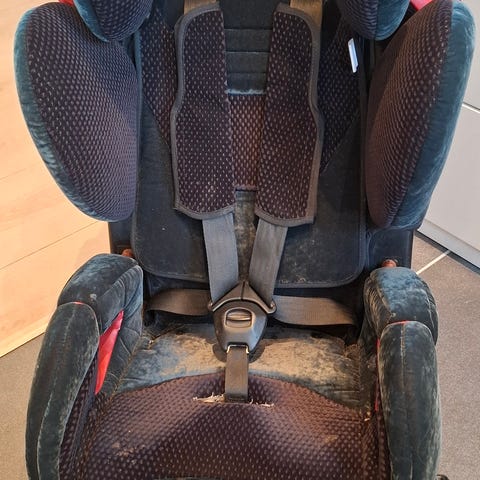 Recaro barnesete, størrelse 36. Setet har en polstret overflate og gir rygg- og sidebeskyttelse. Det festes til bilsetet med sikkerhetsbelte. Trekket er laget av blått stoff. Passer for bruk i personbiler for barn innenfor passende vekt- og høydeområde for størrelse 36. Merk: Sikkerhetsbeltet mangler, som vist på bildet.