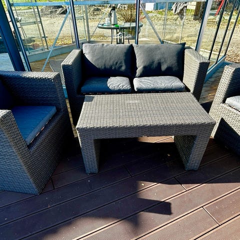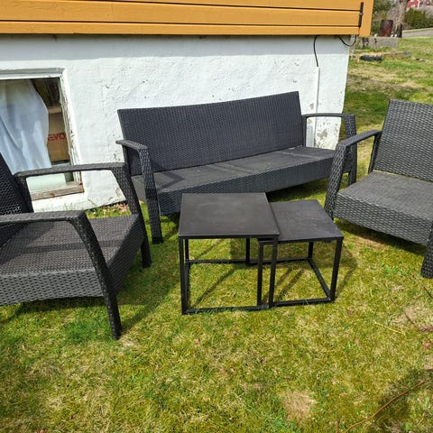 Møblene er pent brukt og har vært vinterlagret under tak, noe som har bidratt til å holde dem i god stand. Ingen synlige skader i rottingen.