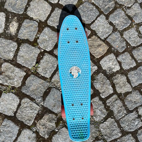 Skateboard i plast med rød deck og grønne hjul. Klassisk cruiserform med strukturert overflate på toppen for bedre fotfeste. Undersiden har integrerte ribber for økt stabilitet. Passer til bruk på jevne underlag som asfalt og betong. Egnet for kortere turer og enkel cruising.