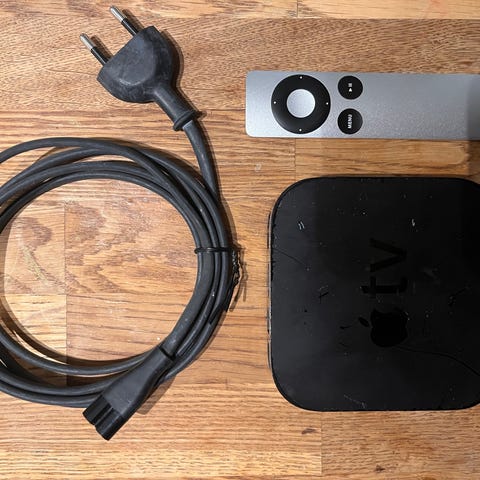 Apple TV 4K (1st gen) med medfølgende fjernkontroll og strømkabel.