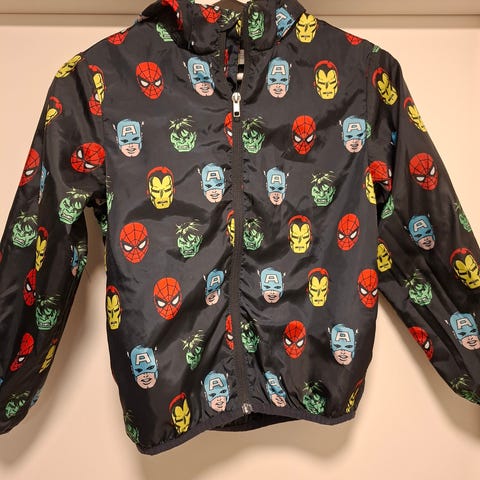 H&M Marvel jakke for gutt i størrelse 116. Jakken er laget i polyester og har et flerfarget Marvel Comics-motiv med ulike superhelter. Den har hette og glidelås foran. Innvendig navnelapp for merking av eier. Passer som lett ytterjakke til hverdagsbruk.