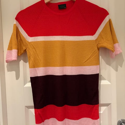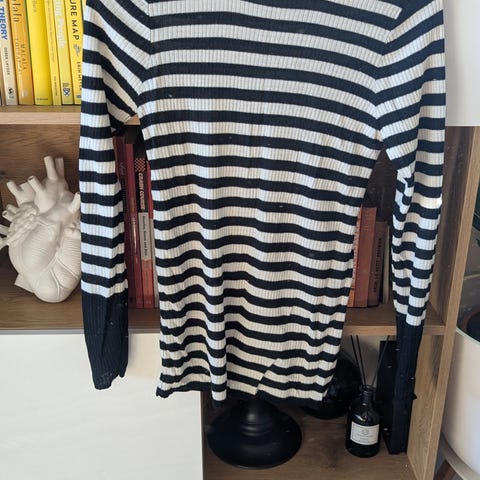 Laget av 55% ull, 45% tencel. Laget av Pierre Robert i samarbeid med Jenny skavland. Hvite og sorte striper, størrelse small/ medium.