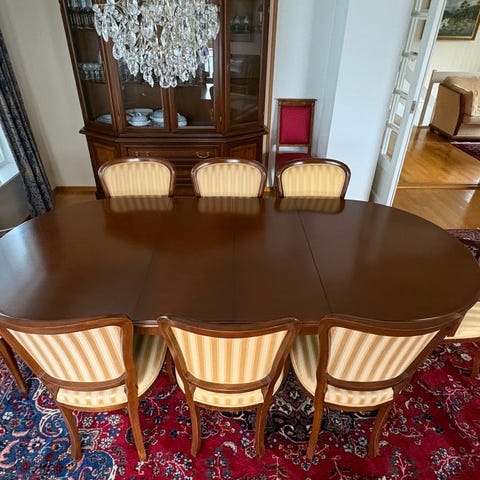 Herskapelig spisestue med skap, og bord med 6 stoler.