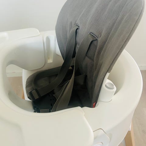 Stokke Steps babysete med brett i hvit plast og grå polstret sittepute. Setet har integrert sele for å holde barnet på plass. Det kan monteres på kompatibelt Stokke Steps-understell etter behov. Avtakbart brett gir plass til lek eller måltider, og den glatte plastoverflaten gjør det enkelt å tørke av og holde rent.