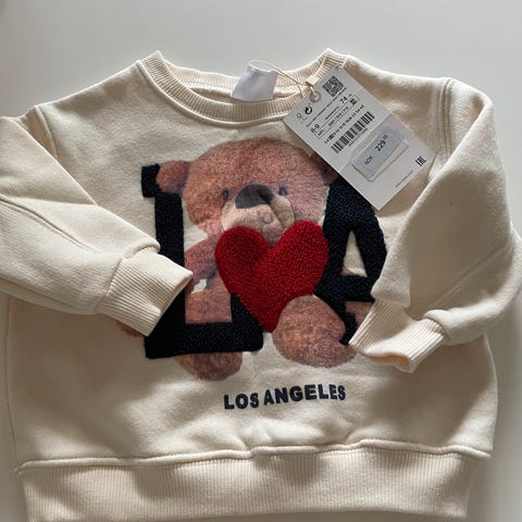 Zara genser for barn i størrelse 92. Unisex-modell i beige bomull med rund hals og lange ermer. Genseren har motiv av bamse med tekst både foran og bak. Laget i mykt bomullsmateriale for behagelig bruk.