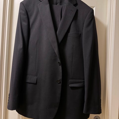 En ubrukt dress fra Frislid selges. Dressen er sort med vertikale sølvgrå striper. Dressen består av 60% ren Ull, 38% Polyester og 2% Elastan. Dressen er strøken og enkelte lommer er enda ikke sprettet opp. Størrelsen er 60 B2 (LIV: 104 og IL: 86)