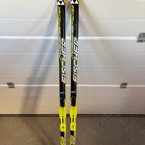 Fischer RCS Sprint Crown langrennski med integrerte bindinger. Klassiske langrennski smørefri. Fargekombinasjon i gult, svart og grønt med Fischer-logo og RCS Sprint Crown-markering på skiene.