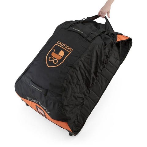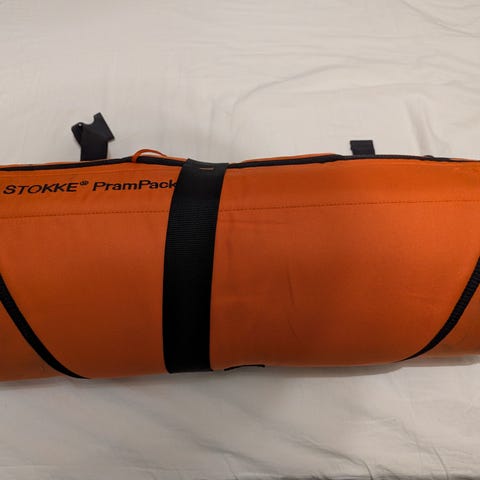 Stokke PramPack transportbag til barnevogn i svart og oransje. Transportbagen er utviklet for å beskytte barnevogn under reise og oppbevaring. Den har polstret konstruksjon, bærehåndtak og stropper for å feste og sikre vognen inni bagen. PramPack kan rulles sammen når den ikke er i bruk for enklere lagring og transport.
