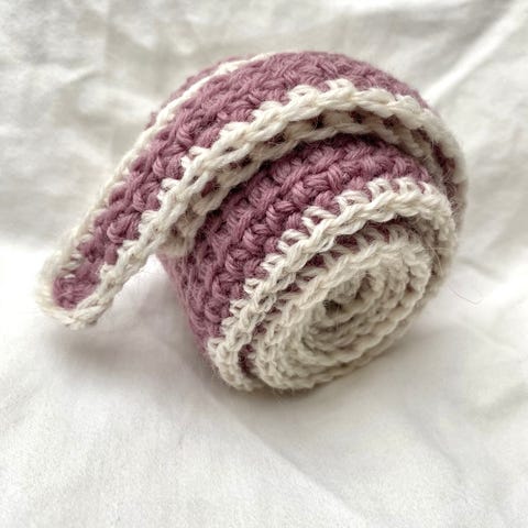 Oppskrift: https://www.haekelreigen.de/minischal-tunesisch-haekeln/ (men har gjort modifikasjoner).
