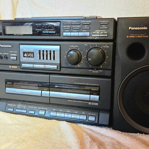 Panasonic stereopakke med hovedenhet og to høyttalere. Anlegget har innebygd CD-spiller, kassettspiller og radio. Fronten har display og betjeningsknapper for valg av kilde, volum og innstillinger. Høyttalerne er separate enheter som kan plasseres på hver sin side av hovedenheten. Egner seg til avspilling av CD-plater, kassetter og radiolytting i hjemmemiljø.