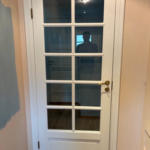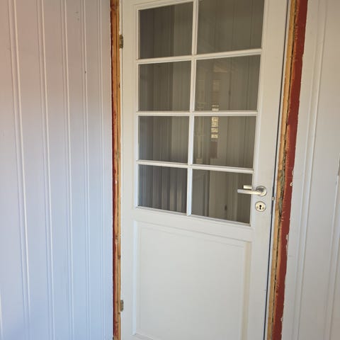 Tofløyet innerdør med glassfelt i hvit utførelse. Døren har sprosseinndelte glassruter i begge dørblad og tette felter nederst. Leveres med karm, hengsler og dørhåndtak. Oppgitt mål er ca. 129 x 210 cm. Egner seg som innerdør der det er ønskelig med lysinnslipp gjennom glassfeltene. Dørbladene er 40cm og 82,5cm.