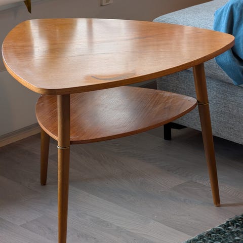Utrolig nett lite side bord med flott blad formet avis/magasin hylle under og med svarte "knotter" på beina. Et skikkelig blikkfang. Teak platen er litt slitt og har noen bruksmerker.
