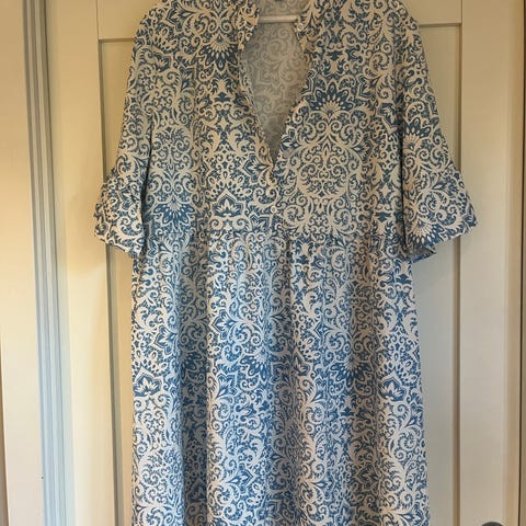 H&M sommerkjole for dame i størrelse 40. Kjolen er laget av 50 prosent lin og 50 prosent viscose og har et flerfarget mønster i hovedsakelig blått og hvitt med motiv av landskap , dyr og natur. Ermene har knyte-detaljer og en åpning langs siden. Passer som lett sommerkjole eller tunika til hverdagsbruk eller ferie. Materiale: lin/ viscose. Farge: flerfarget (blå/hvit). Størrelse: 40.