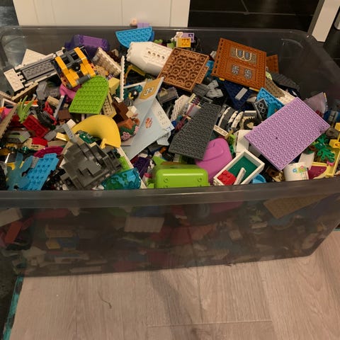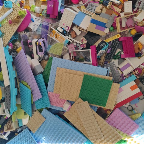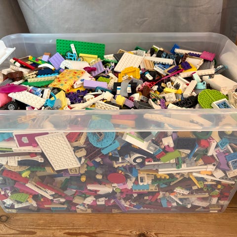 Diverse LEGO og LEGO Friends klosser og deler i blanding av ulike sett og farger. Inneholder blant annet byggeklosser, plater, vegger, kjøretøy, figurer og små tilbehørsdeler typiske for LEGO og LEGO Friends-serien. Egnet som påfyll til eksisterende LEGO-samling eller til fri bygging og lek. Antall deler og komplette sett er ikke spesifisert. Inneholder blandt annet LEGO friends hus, LEGO politi og brannstasjon.,