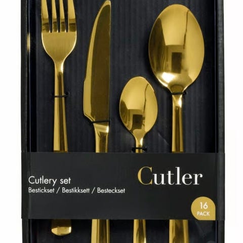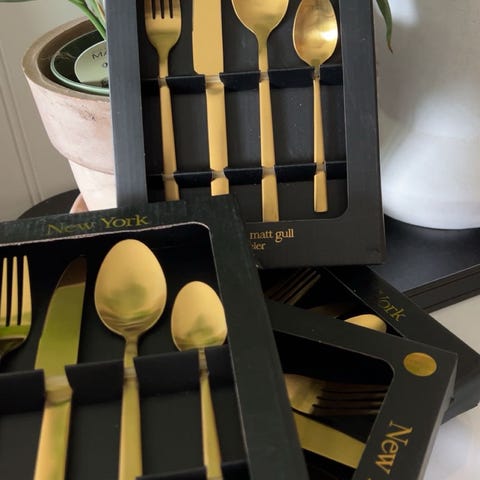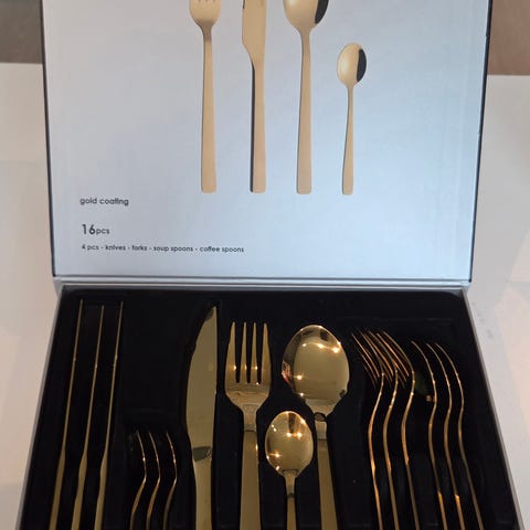 Nytt og ubrukt gullfarget bestikksett til 6 personer selges billig.