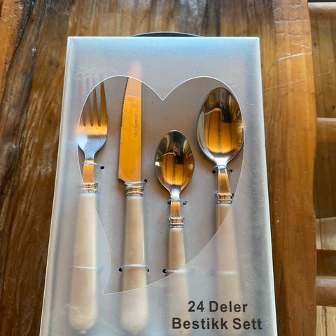 Består av gaffel, kniv, spiseskje og teskje. Selges komplett i eske.