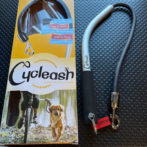 Sykkelstang til hund med line i svart farge. Består av to stenger som festes på sykkelrammen, med fjærbelastet feste og medfølgende bånd med karabinkrok til hundens sele eller halsbånd.