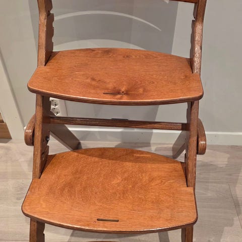 Meget pent brukt barnestol i heltre / metall / bomull stoff
