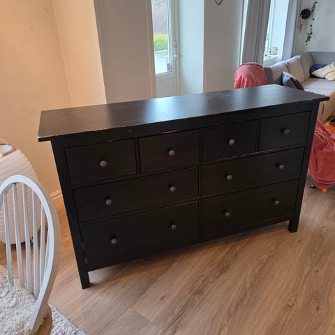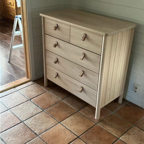 Gammel kommode fra IKEA. Kledd i decorplast fra Lindas dekor, og nye knotter til skuffene. Redesignet for noen år siden og gis bort pga. plassmangel.