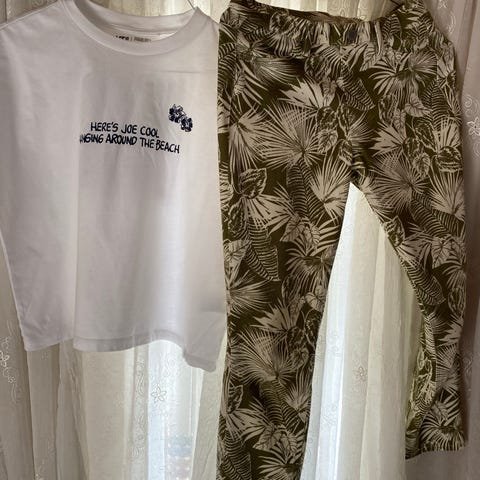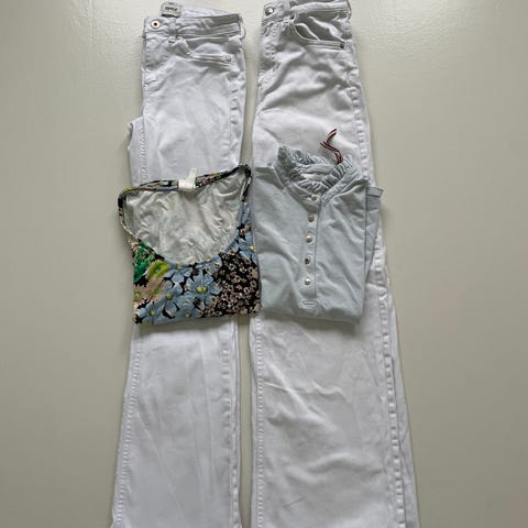 Klær til dame str Xs kr 300,- Buksen er fra Bik Bok, off White, str 26/30.Følger med en T-shirt fra Ginatricot i str Xs og en topp fra Stradivarius i str S. Se bilder. Sendes mot porto.