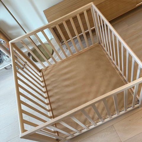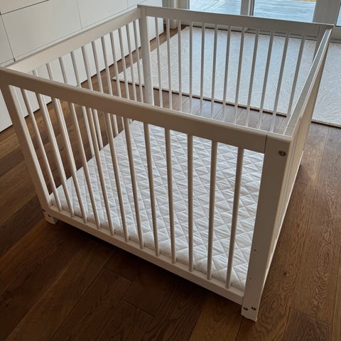 Selger Troll Lekegrind 1x1 meter. Den er enkel og montere og kan justeres i to høyder som muliggjør lengre bruk. Den er avbildet på nederste høyde. Madrass med trekk følger med.