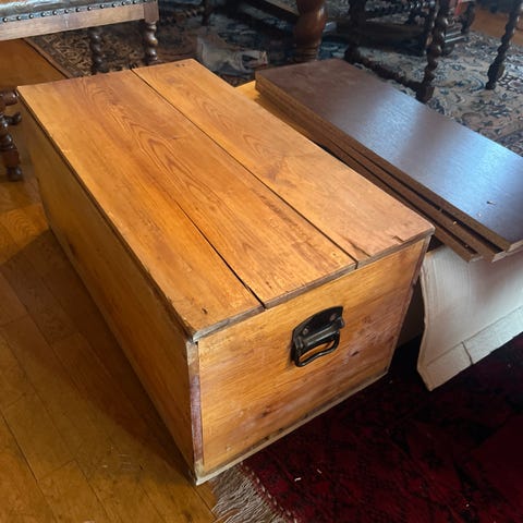 Stor trekkiste i tre i brun farge. Kisten har buet lokk og er utstyrt med låsbeslag i metall foran. Innvendig er det et hovedrom samt et mindre rom langs den ene siden for separat oppbevaring. Egnet til lagring av verktøy, utstyr eller annet innhold i garasje, bod eller verksted.
