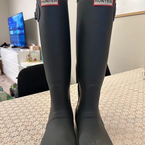 Selger et par sorte Hunter Original regnstøvler i størrelse 39. Klassiske høye gummistøvler med justerbar spenne øverst på skaftet for bedre passform.