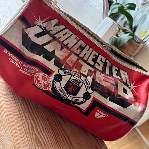 Manchester United skulderveske med klubbens originale logo. Vintage 70-talls bag, både skulder-rem og glidelås er helt i orden.