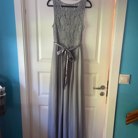 JDY kjole til spesiell anledning i størrelse S. Kjolen er blå og laget i tyll. Overdelen har blonder og dekorative detaljer, mens skjørtet er langt og lagdelt i tyll. Passer til formelle anledninger som konfirmasjon, bryllup eller andre selskaper der en lang kjole ønskes.