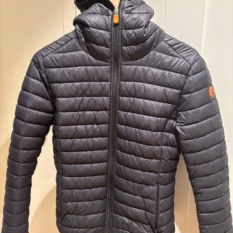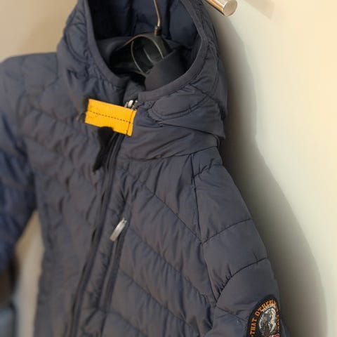 Parajumpers Fleece & Puffer hybridjakke for gutt i størrelse 158/164 (L) Jakken er marineblå og fylt med dun i front og øvre del av rygg, ermer i bomull. Den har hette, glidelås foran og sidelommer med glidelås.
