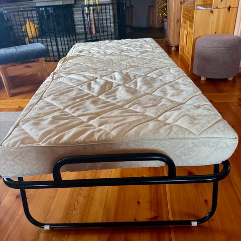 Sammenleggbar seng kjøpt på Jysk for flere år siden. Madrassen er ikke av de beste. Sengen har stått lageret tørt, men sammenleggbar. Madrassen kan derfor skiftes ut, men fungerer. Sengen måler 1,90x80 cm utstrakt og 150 cm høy og 32 cm dyp når den er lagt sammen. Kjøper må selv hente