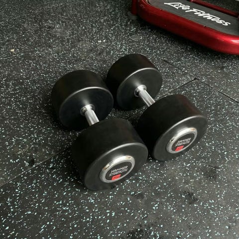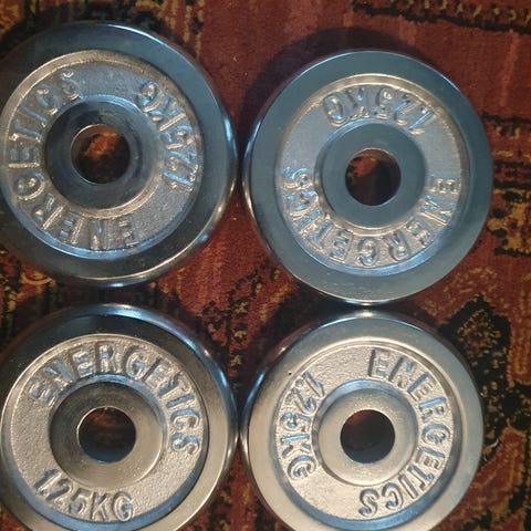 Selger vekter egnet til styrketrening hjemme. Noen løse vektskiver og et praktisk sett med håndmanualer. Settet gir mulighet for ulik vekt på manualene ved å kombinere ulike skiver.