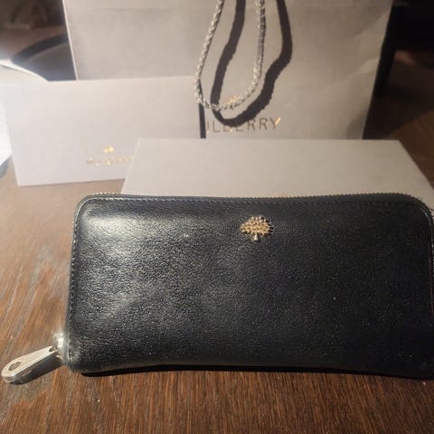 Mulberry lommebok for dame i svart skinn. Lommeboken har klaff med trykknapp og et rundt metallmerke med Mulberry-logo på forsiden. På baksiden er det en glidelåslomme. Innvendig har lommeboken flere kortlommer og rom for sedler og kvitteringer, samt egen glidelåslomme for mynter eller småting. Passer som hverdagslommebok eller til oppbevaring av kort og kontanter i veske.