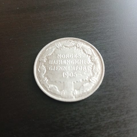 Norges første minnemynt sølv 2 krorner fra 1906.