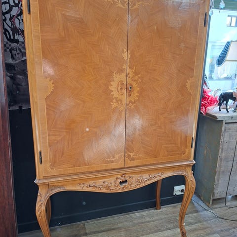 Gammelt hvitmalt skap. Noen mangler på frontdekor. Bør males.
