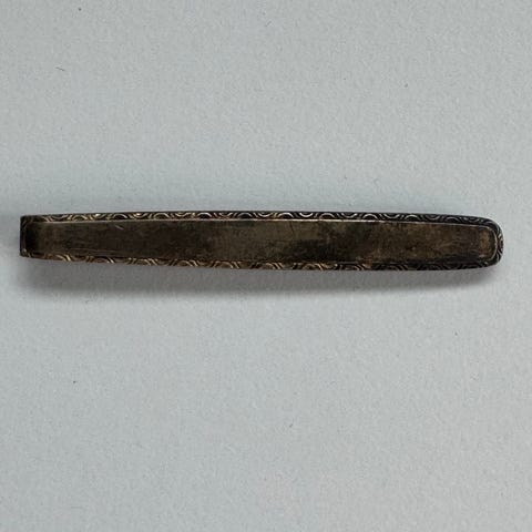 Klassisk og tidløs slipnål fra 50-tallet, med dekorative striper som gjør at den "skinner" litt mer, vs. å være helt slett. Blank underside. Slipsnålen har ligget nedpakket i mange år og er svært lite brukt (ikke siden 50-tallet). Forgyllingen er meget pen. Stemplet ansvarsstempel og 830S