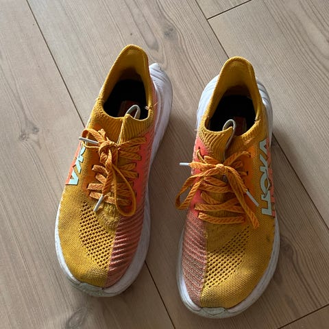 Hoka løpesko for løping i størrelse 37. Skoene har overdel i tekstil/mesh i hovedsakelig hvit farge med turkis og røde detaljer i sålen. Modellen har snøring og mellomsåle med tydelig demping tilpasset løping på asfalt eller hardt underlag. Passer til trening og løping for den som bruker sko i størrelse 37. Di er godt brukt men mest skittene og de har signatur fra Tobias beks