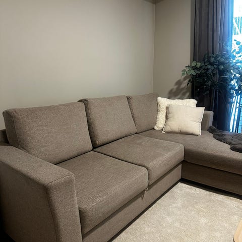 Selger en stilren og komfortabel 3-seter sofa med tilhørende puff i lys grå farge. Sofaen har et moderne, nordisk uttrykk og passer godt i både stue og leilighet. Puffen kan brukes som fotskammel, ekstra sitteplass eller som forlengelse av sofaen.