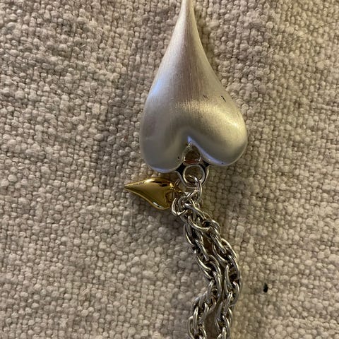 Spiren er solgt. Oksidert sølvblad og liten sølvspire med liten diamant og rutilkvarts selges. Bladet 2000 kr og spiren 4000, om begge kjøpes kan grå silkesnor medfølge. Endestykker i sølv. Obs! Liten klump på snor, se bildet.