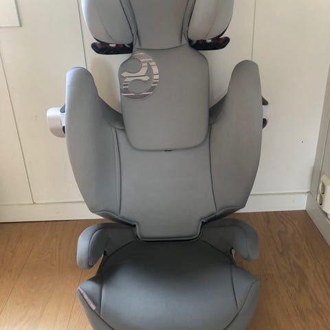 Cybex barnesete. Setet har høy rygg og sidestøtter som gir støtte til barnets hode og overkropp. Justerbar høyde slik at det passer alle barn innenfor høyde 100-150 cm. Trekket er i rødt tekstil. Barnesetet festes med isofix, og barnet sikres med bilens trepunktsbelte i henhold til instruksjonene som er avbildet på siden av setet. Pent brukt uten flekker eller slitasje.