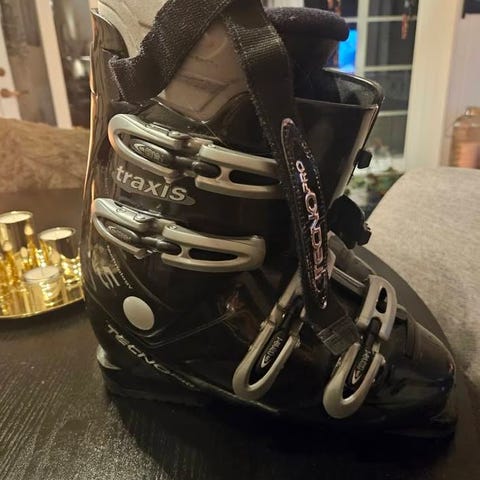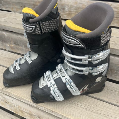 Salomon alpinstøvler i størrelse 27.5 (EU 43 1/3, UK 9, US 9.5) for herre. Støvlene har fire spenner i metall og powerstrap øverst for bedre tilpasning rundt leggen. Overdelen er i gjennomsiktig gul plast med kontrastfargede spenner. Egnet til alpint bruk i alpinanlegg.