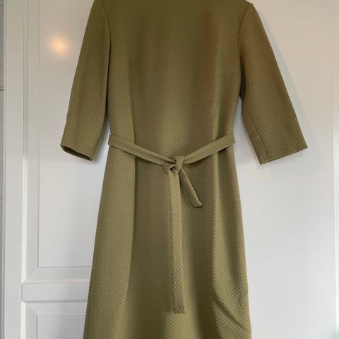 Mål: Bryst -43 cm, midje- 40cm, hofte- 44 cm, lengde- 128 cm fra skuldersøm til nederst.