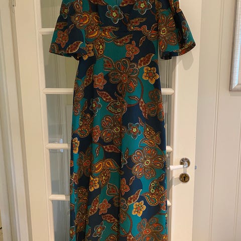 Lekker kjole fra 70 tallet, sydd i familien. Meget bra håndverk og i god vintage stand. Er emipresnitt i livet og volumiøse 3/4 ermer med mansjetter. Den vil passe ca 36, liten 38.