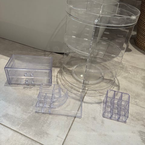 Fått i gave, aldri brukt. Lappen er av, men da ikke brukt. Ferdig montert, men man velger selv hvor man vil ha hyllene for å få sminken sin til å passe inni og oppå.