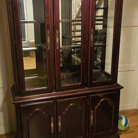 Vitrineskap i tre med utskårne detaljer og glassdører i øvre del. Skapet har tre glassdører med sprosser og hyller bak for oppbevaring og utstilling av servise, glass eller pyntegjenstander. I midtpartiet er det flere skuffer som kan brukes til bestikk eller småting. Nederst har skapet tredører med utskårne felter og skapplass til oppbevaring. Passer i stue eller spisestue som oppbevarings- og utstillingsmøbel.
