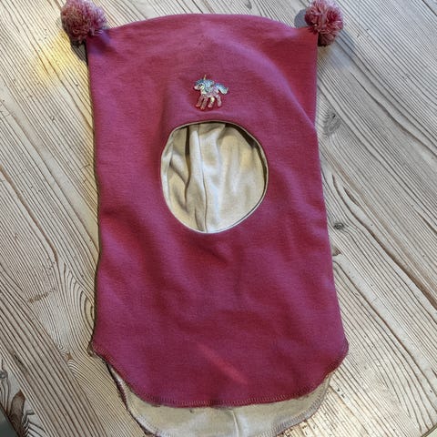 Kivat balaclava i ull til barn, unisex, i størrelse 3. Balaclavaen er rød med mønster og har to dusker på toppen. Innsiden er i mykt, lyst stoff for komfort mot huden. Passer til bruk i kjøligere vær for å dekke hode, hals og deler av overkroppen. Laget i ull som gir god isolasjon og varme.
