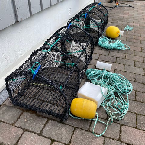 2 stk krabbe og hummer teiner og 1 stk vakuum lukket plast tank m/agn til ekorn